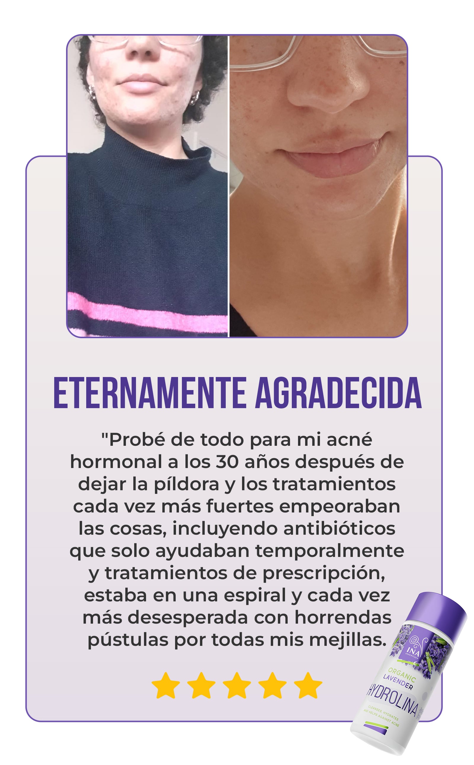 La Hydrolina de Lavanda ofrece más que una solución rápida. Funciona desde la raíz, limpiando profundamente los poros para prevenir futuros brotes, asegurando una piel clara y brillante de larga duración.